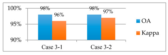 In correctness analysis, the integration of all features (Case 2-3) improved the accuracy from 1.1 to 65.6 percentage points. Most accuracy indices from spectral features were higher than those from geometrical features (Table 7); in other words, the results indicate that the use of LiDAR spectral features contributes more than the geometrical features. The OA of spectral features reaches 93% but only 64% for geometrical features (Figure 10) because of the higher accuracy for buildings and trees but lower accuracy for grasses, roads, and soils. The results demonstrate that spectral features from LiDAR could be useful features in land cover classification when multi-wavelength intensities are available.