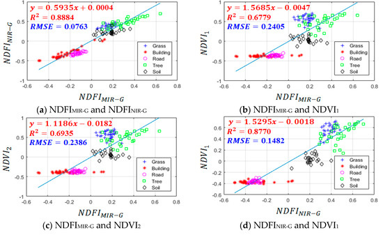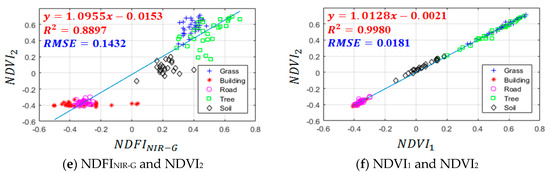 We also used the training data to calculate the coefficient of determination (R2) among these vegetation indices (Figure 14). For each training dataset, four vegetation indices were extracted from both active and passive sensors. Any two vegetation indices were selected to determine the similarity between them, and six combinations were selected for similarity analysis. The R2 between two passive vegetation indices (i.e., NDVI1 and NDVI2) reached 0.99 while the R2 between two active vegetation indices (i.e., NDFIMIR-G and NDFINIR-G) reached 0.88. The R2 among active or passive vegetation indices showed high consistency in these training data.