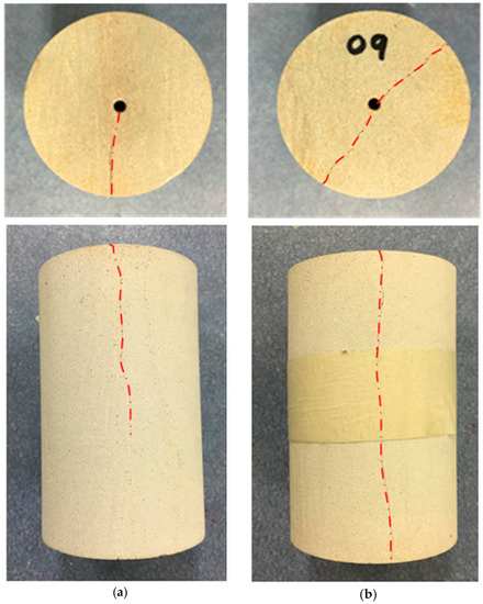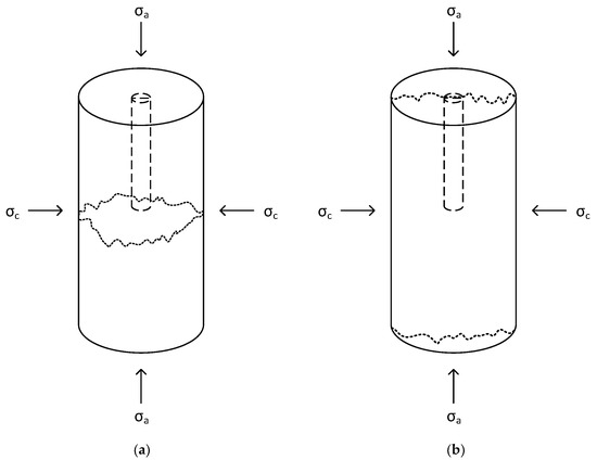 The breakdown pressure and morphology of the induced fractures are key parameters in hydraulic fracturing and are dependent on both the fracturing fluid type and the applied stress condition [21,24]. Under triaxial conditions, two main stresses act on the rock sample: axial stress and confining stress, and the fractures created in hydraulic fracturing always propagate perpendicular to the minimum stress direction or in the plane of maximum principle stress. Therefore, under triaxial conditions, hydraulic fracturing can be done in two different ways: (1) when the axial stress is less than the confining stress, the fracture will open across the wellbore (horizontal plane) (Figure 1a); and (2) when the axial stress is greater than the confining stress, fractures will open along the wellbore (vertical plane) (Figure 1b). In this paper, only the fractures along the wellbore (vertical plane) are considered, and in this situation, the breakdown pressure can be estimated using Equation (1) [9], the HW (Hubbert–Willis) criterion).