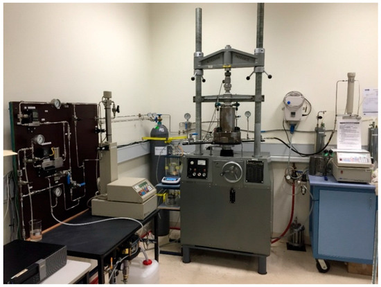 High-pressure triaxial setup used to conduct fracturing and permeability tests.