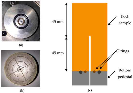 (a) Bottom pedestal for fracturing; (b) bottom pedestal for permeability; and (c) configuration of O rings with sample.