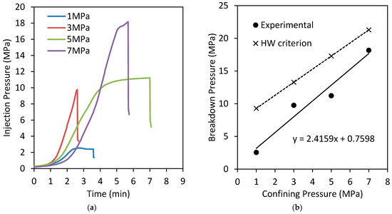 (a) Variation of injection pressure with time for different confining pressures; (b) variation of breakdown pressure with confining pressure experimentally and HW criterion.