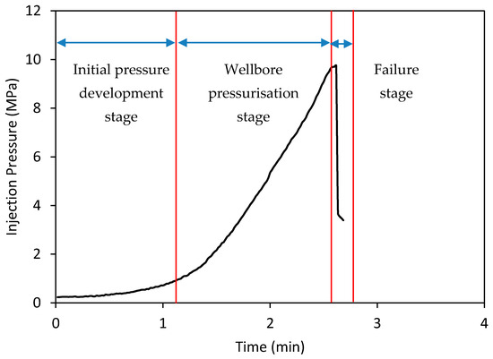 The different injection pressures over time in intact siltstone specimens at various confinements, when the flow rate was maintained at a constant rate of 5 mL/min, are shown in Figure 4a. According to the figure, injection pressure generally increases over time until it reaches the breakdown pressure of the sample. This significant pressure development occurred due to the low permeability of siltstone, and the injection flow rate (5 mL/min) was therefore much higher than the flow penetration rate through the rock matrix, which created an injection pressure development until the final failure. Figure 4a exhibits three main regions in the pressure development, regardless of confinement, and these are clearly shown in Figure 5. The first stage is the initial pressure development stage, at which pressure development with time is comparatively small and almost horizontal, because water more easily enters the accessible pores in the sample until they fill, giving only a small chance to fluid remaining in the upstream to undergo pressure development. However, in the second wellbore pressurization stage, most of the nearby pores are already filled and saturated. Therefore, the injected water cannot easily enter the pores and accumulates in the upstream with the developing pressure there. At the final failure stage, the sample breaks, creating a sudden pressure drop, because sample failure occurs, creating many fractures that offer much easier flow paths to the fluid. This is consistent with the similar pressure development trends observed by Deng et al. [7] for concrete specimens.