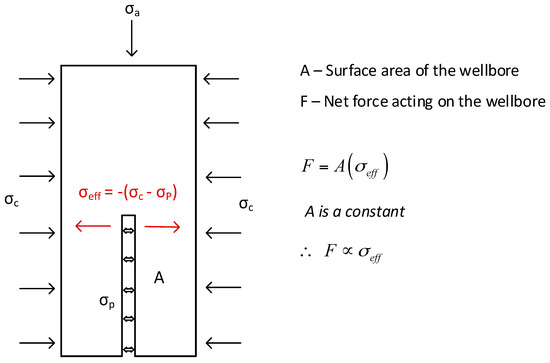 where σeff is the effective stress, σc is the confining pressure or stress, and σp is the pore pressure of the sample. This equation can only be used based on two main assumptions: the rock grains are incompressible and the yield stress in the grain material is independent of the confining pressure [33], both of which are applicable to siltstone. As shown in Figure 7, the effective net force acting on the surface of the wellbore in the outward direction is always proportional to the negative effective stress, because the surface area of the wellbore remains constant throughout the fracturing process. As previously stated, the negative effective stress is positively correlated with the confining pressure. Therefore, the net force acting on the wellbore surface is high at higher confining pressures. This means that greater force and higher energy can cause a complete diametrical fracture through the wellbore.