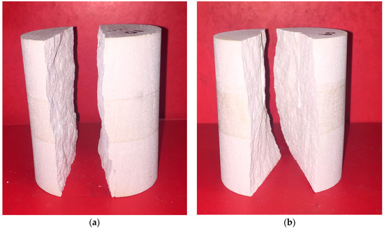 The effect of confinement on the fracture pattern and failure surface of water-fractured samples was then analysed, based on the images taken before and after fracturing. According to the failure patterns, when the confining pressure is 1 to 3 MPa, the fracture is radial (the fracture occurs only on one side of the sample) and when the confining pressure is 5 to 7 MPa, the fracture is diametrical (the fracture continues through the diameter of the sample). Figure 6 shows the fracture patterns observed in samples which failed at 1 MPa and 7 MPa confinements. The reason for the different failure patterns under low and high confinements can be explained using the negative effective stress principle. According to Figure 4, the breakdown pressures are around 2.5 and 18.2 MPa at 1 and 7 MPa confining pressures respectively, and the corresponding negative stresses are around 1.5 and 11.2 MPa, respectively. See Equation (11) [32]: