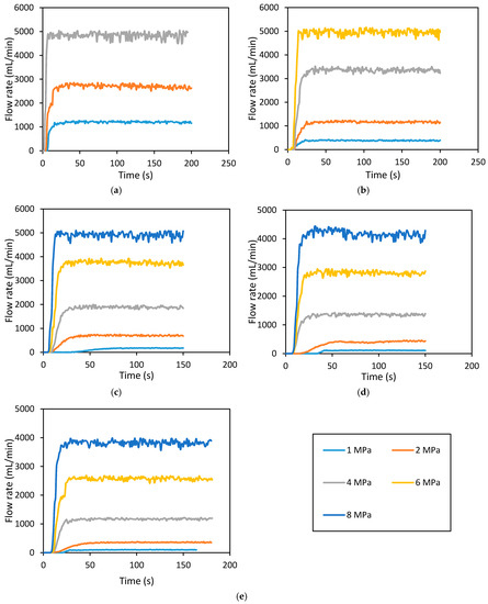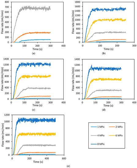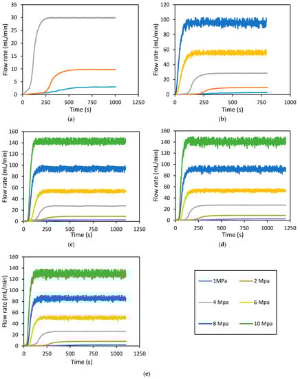 Downstream flow rate development with time for hydraulically fractured rock specimen (at 7 MPa confining pressure), during permeability tests. (a) 5 MPa; (b) 10 MPa; (c) 15 MPa; (d) 20 MPa; and (e) 25 MPa confining pressures.