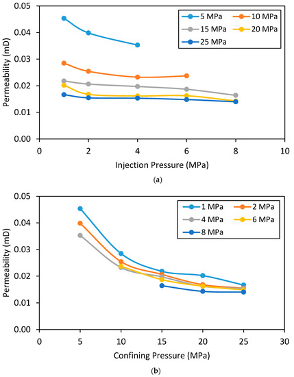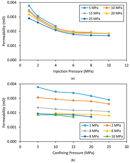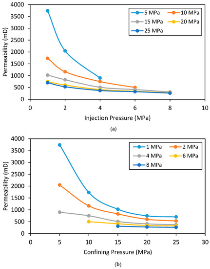 The effect of injection pressure and confining pressure on the N2 permeability of intact and fractured siltstone permeability was then examined. Figure 12 shows these effects on the permeability of intact siltstone. According to Figure 12a, siltstone permeability first gradually (up to 6 MPa) and then slowly decreases with increasing injection pressure (up to 10 MPa) and eventually comes to a steady state (>10 MPa). For example, at 25 MPa confining pressure, when the injection pressure is increased from 1 to 6 MPa and 6 to 10 MPa, the permeability of the intact siltstone reduces by around 38% and 5%, respectively (Figure 12a). This clearly shows the significant influence of injection pressure on siltstone permeability at low injection pressures (<6 MPa) is greatly reduced at higher injection pressures (>6 MPa). This may be related to the Klinkenberg slip flow effect, which explains the difference between gas and liquid permeability in porous media using the “slip flow” phenomenon [40]. According to Klinkenberg [40], the collisions between gas molecules and solid walls introduce an additional flux to the system when the pore radius is similar to the mean free path of the gas molecules. According to existing studies, gas permeability through various reservoir rocks can be reduced with increasing injection pressure due to this phenomenon [34,41,42,43,44]. This slip flow effect is therefore responsible for the observed gradual reduction in N2 permeability from 1 to 6 MPa, and the observed negligible reduction in N2 permeability after 6 MPa is possibly due to the increased advective flux effect caused by the reduced effective stress, which seems to reduce the slip flow effect.