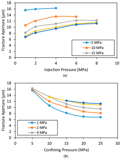 Variation of fracture aperture for hydraulically fractured rock specimen with 7 MPa confining pressure (a) with injection pressure and (b) with confining pressure.