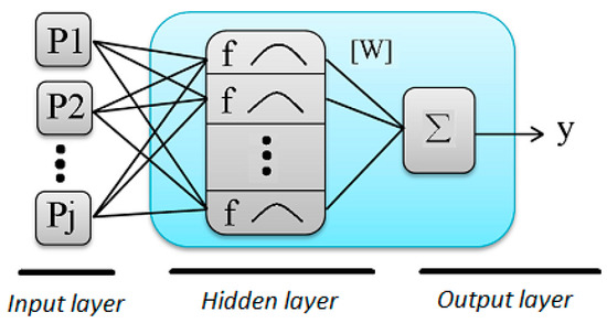 Artificial neural networks (ANNs) are inspired by biological neural networks. ANNs include a set of processing components, called neurons, which operate in parallel processes and transmit information to other neurons, similar to the functioning of a biological brain. ANNs are an efficient method for modeling complex input-output relationships and can learn relationships directly from the data being modeled [31]. The nonlinearity within a radial basis function (RBF) network can be selected from a few classic nonlinear functions. The hidden layer carries out a fixed nonlinear transformation with no adjustable variables, and it maps the input onto a new layer. The output layer then performs a linear combination on this new layer, and the only adjustable variables are the weights of this linear combiner [32]. A general RBF network is schematically illustrated in Figure 1.