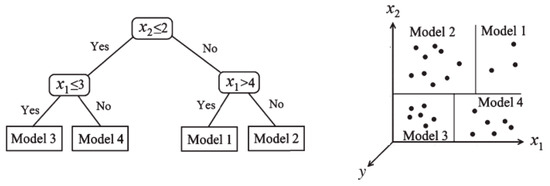 Quinlan [46] explained the M5Tree, which includes a regression function at the terminal nodes. In fact, the M5 algorithm employs the idea of splitting the parameter space into subspaces and building a local linear regression model in each. The splitting follows the concept used in building a decision tree (see Figure 2).