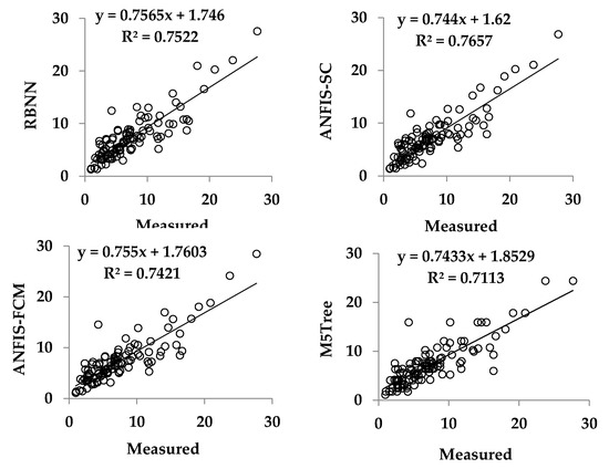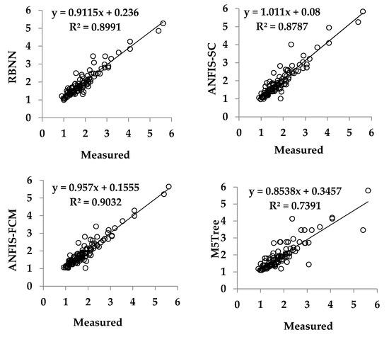 Testing and training results for the prediction of strength of the RBNN, ANFIS-SC, ANFIS-FCM and M5Tree models are listed in Table 2. The control parameter values of the optimal models are also provided in the second column. Different numbers of parameters and structures were tried for each method and the optimal ones were selected. Gaussian membership functions are used in ANFIS-SC and ANFIS-FCM models. The RBNN, ANFIS-SC and ANFIS-FCM methods can be easily obtained and applied by using new RBNN, genfis2 and genfis3 tools in MATLAB command windows. For the M5Tree method, code which is available for free online (http://www.cs.rtu.lv/jekabsons/regression.html) is used.