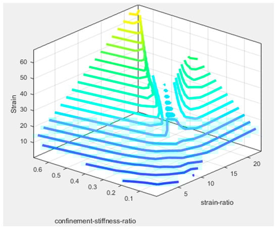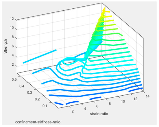 This figure shows that the estimates of the ANFIS-SC model are closer to the corresponding measured values, especially for high strain values. The variation of strength versus strain ratio and confinement stiffness ratio for the optimal ANFIS-SC model is shown in Figure 7. It is clear from the figure that strain takes its maximum value when the strain ratio and confinement stiffness ratio are both at their maximum values. The linear relationship between strain and strain ratio is clearly seen in the range of confinement-stiffness-ratio between 0.4 and 0.6.