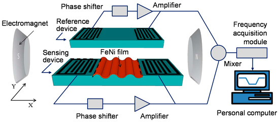 Then, a FeNi-coated SAW based current sensor was constructed, which was composed of a differential SAW delay line oscillator configuration, and magnetostrictive FeNi thin film deposited along the SAW propagation path of the sensing device. The scheme and working principle of the proposed sensor are depicted in Figure 1. YZ-LiNbO3 was utilized as the piezoelectric substrate, which provides larger electromechanical coupling coefficient (4.1%) to reduce the insertion loss of the SAW chip, and linear temperature coefficient of frequency (TCF) contributing to the temperature compensation by using the differential structure mentioned in Figure 1. Additionally, the single phase unidirectional transducers (SPUDTs) with Al electrodes were used to structure the SAW device to reduce the insertion loss [18,19]. The FeNi thin film was then coated on the top surface of the sensing device by RF magnetron sputtering and overlay technique. Prior to FeNi coating, a 50 nm SiO2 film was deposited on the piezoelectric substrate to provide a well protection on interdigital transducers (IDTs) in procedure of FeNi coating. The FeNi film produces magnetostrictive strain stimulated by the electromagnetic field, where the thickness, density and young’s modulus of the FeNi film are changed accordingly, and then the SAW propagation characteristic are modulated in the form of shift in SAW velocity. The applied electromagnetic field can be evaluated by using the corresponding differential oscillation frequency signal. Utilizing the Helmholtz coil system, the developed SAW sensor was characterized, and in comparison to FeCo coated sensor.