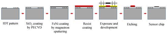 Two SAW delay lines with two photolithographically defined 100 nm Al interdigital transducers (IDTs) separated by a 2.5 mm length of propagation path were reproducibly fabricated on a same piezoelectric YZ LiNbO3 wafer. The launch and receive SPUDT pairs were set to 60 and 30, respectively. The acoustic aperture is 100λ (λ stands for the wavelength corresponding operation frequency of 150 MHz: 23.19 μm). Following the preparation of delay line patterns, a SiO2 thin film (50 nm) was deposited on the SAW device surface to protect the electrodes in process of FeNi coating by using the plasma enhanced chemical vapor deposition (PECVD). Prior to FeNi coating, the SiO2 film surface was cleaned of any contaminants by a routine cleaning procedure involving rinsing in acetone solution, a DI water rinse and drying by N2. Then, the magetostrictive FeNi film with various aspect ratio (1:1, 1.5:1 and 2:1) was deposited onto the sensing device surface by RF magnetron sputtering (JGP-560C magnetron sputtering equipment) and overlay technique from a FeNi target (nominal composition). The base pressure is 2 × 10−4 Pa. The Ar was used as the sputtering gas, and corresponding pressure is set to 1 Pa. The power density of the target was 400 V (DC) × 80 mA/p (35 mm)2. Various FeNi thicknesses (300, 500 and 700 nm) were obtained by controlling the sputtering time. The specific technological process is depicted in Figure 6. Figure 7 is the picture of the developed FeNi-coated sensor chip, and FeNi coating was indicated by the dark area. The surface morphology of FeNi coating was observed by JSM5600-Lv scanning electron microscopy (SEM) (JEOL, Tokyo, Japan), as shown in Figure 8. It can be seen that the prepared FeNi film are densely and uniformly distributed. To make the comparison, 500 nm FeCo film with aspect ratio of 2:1 was also deposited onto the similar SAW device surface to form a FeCo-coated sensor.