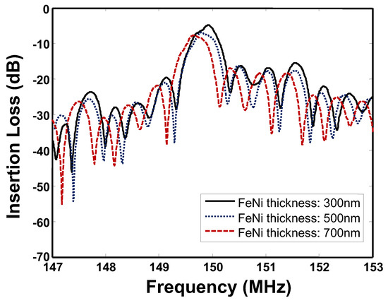 Next, the FeNi-coated SAW sensor chips with various FeNi thickness (300, 500 and 700 nm) were characterized by using the network analyzer, as shown in Figure 9. With increases in FeNi thickness, the operation frequency of the sensor chip decreases owing to the mass loading effect from the FeNi coating. The measured operation frequency and insertion loss of the sensor chip with 300, 500 and 700 nm FeNi (with aspect ratio of 2:1) are 149.9 MHz and 5 dB, 149.7 MHz and 7 dB, 149.6 MHz and 8 dB, respectively.