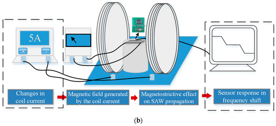 The physical map and schematic diagraph of the experimental setup for current sensor characterization were shown in Figure 10. The experimental setup was composed of the developed SAW current sensor, DC current source (YangZhou Huatai Electronics Co., Ltd., Yangzhou, China), Helmholtz coil (Tianduan Industry Co., Ltd, Shanghai, China) for stimulating the magnetic field under giving current, PC and Gauss meter (Tianduan Industry Co., Ltd) for calibration (Figure 10a). Usually, the strongest magnetic field intensity and the best uniformity occur at the central axis of the Helmholtz coil, hence, the sensor was positioned at the central axis of the platform in the middle of the coil. As shown in Figure 10b, the applied current for Helmholtz coil stimulates electromagnetic field, and the corresponding sensor response induced by the magnetostrictive effect was taken from the oscillation frequency signal connected at 1 point per 50 ms by the FPGA.