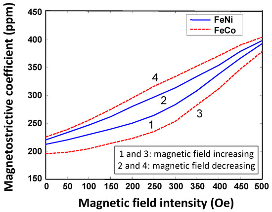 The hysteresis loops of the FeNi and FeCo were characterized by using the resistance strain gauge method [20], as depicted in Figure 12. The horizontal and vertical axes in the graph stand for external magnetic field intensity and magnetostrictive coefficient respectively. The curves 1 and 2 represent the corresponding changes in the magnetostriction of the FeNi coating at increasing and decreasing magnetic field intensity, respectively. Meanwhile, the curves 3 and 4 characterize the relationship between the magnetostrictive coefficient of the FeCo and the external magnetic field. It is clear that the hysteresis loop of FeNi and FeCo were distinctly different. Owing to the week remanence and hysteresis effect, the FeNi alloy exhibits relatively narrow and steep hysteresis loop over the FeCo, which means the FeNi coated sensor will offer better symmetry in current sensing. That is the reason why the FeNi was favored as the magneticsensitive interface for magnetic sensing.