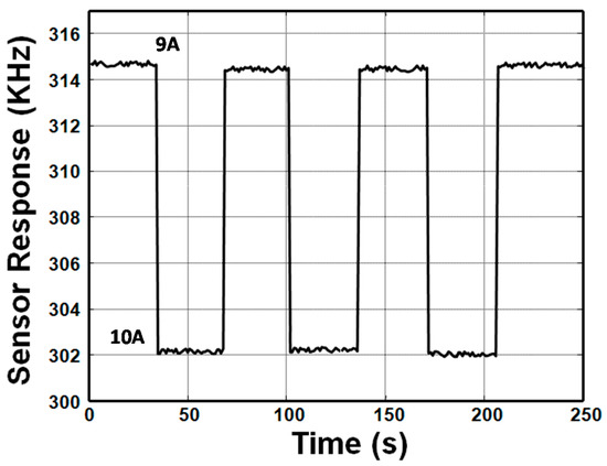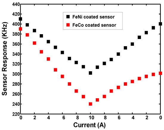 Response and recovery times for current sensing were tested by using the developed FeNi coated current sensor with FeNi aspect ratio of 2:1 and thickness of 500 nm. Sensor response measurements were performed for three consecutive 40-s exposures to current at intensity from 9 A to 10 A, as shown in Figure 14. When the current was varied from 9 A to 10 A, the frequency response showed a rapid rise (only one sampling point) to its steady-state value. When the current was decreased to 9 A, the frequency response rapidly fell to its initial value. From this promising result, we hypothesize that the developed sensor exhibits excellent repeatability and fast response.