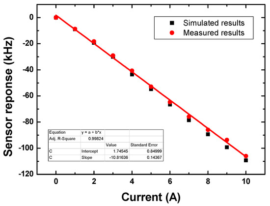 Then, referring to the Biot-Savart law mentioned Equation (16) and velocity-frequency relationship of Δv/vs = Δf/f0 (Δv and Δf are the shift in SAW velocity vs and sensor frequency f0), the current sensitivity of the 150 MHz SAW sensor coated with 500 nm FeNi (aspect ratio is set to 2:1) was calculated as shown in Figure 5, and sensitivity of ~11 KHz/A was expected.