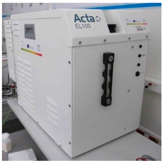 We opted to use an ACTA EL100c electrolyzer (Crespina, Italy) with a dryer hydrogen generator (Figure 5). The technical specifications of the EL100c are as follows: maximum hydrogen flow rate of @ 20 °C/1 bar, 100 NI/h; max. pressure of 30 bar; hydrogen purity of 99.95% @ 30 bar; max. power consumption of 700 W; and max. water consumption of 0.1 L/h [35].