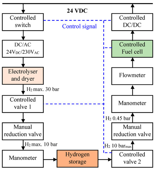 The hydrogen laboratory arrangement is outlined within the block diagram and image shown in Figure 6. The entire circuit can be controlled using LabView made by National Instruments (Austin, TX, USA) and CompactRIO, via a signal communicated by the CWP control program. If an energy surplus is detected, the program will send a signal to activate the relevant controlled switch; the electrolyzer and dryer will then start to operate. The electrolyzer is capable of producing very clean (with 99.95% purity) dry hydrogen at 30 bar. Such a high pressure has to be decreased to the value of 10 bar by means of a manual reduction valve; the reduced pressure is applied to fill the hydrogen storage, namely, the metal hydride canister.