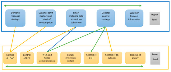 The control framework is centrally implemented in LabView. The algorithm recognizes two control levels, a higher and a lower one (Figure 8). The lower layer is responsible for distributing the energy as needed or according to the higher level strategy. The control commands are transmitted at a very high speed, in the order of milliseconds. The safety of the system and the basic operations are ensured mainly at the lower level. In terms of security, the primary problem lies in monitoring the battery charge to prevent power off take at a low voltage or, conversely, to eliminate any charging if the voltage is too high. These protective elements are contained twice in the model: first, they are installed as hardware in the CB1 and remain effective during the energy transfer between the main network and the other batteries; second, the system comprises software protection, which duplicates its hardware counterpart, and also controls the transfer of energy from the power stations directly into the battery. Specifically, the elements are used in simulating the remote sources, another part of the lower layer. The data from these sources are processed, enabling the influx of a corresponding amount of energy to the grid through two 12 V batteries (denoted as BAT2 in Figure 1).