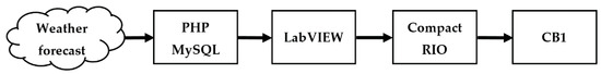 The weather forecast is acquired from a remote web server, https://www.yr.no, providing data related to the temperature, cloud cover, and precipitation, with an interval of one hour. This server was identified as the most effective tool of its kind in satisfying our basic requirements, namely, weather forecasting for the city of Brno, (Moravia, Czech Republic), where the microgrid is located. As indicated in Figure 9, the data from the server are modified using Hypertext Preprocessor (PHP) script, stored in the MySQL database, and then read out to control the microgrid via LabView. The obtained information enables us to direct the energy flows within the individual means of storage, utilizing CompactRIO and CB1.