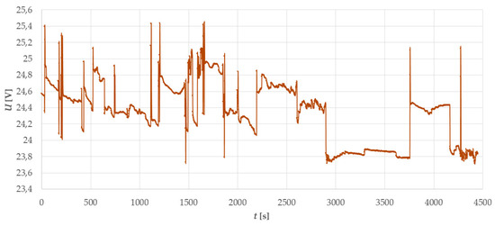 The diagram in Figure 12 indicates that the voltage in the direct current grid stabilized between approximately 23.7 V and 25.4 V. the relative deviation from the 24 V was about 6%, a value acceptable for the connected devices.