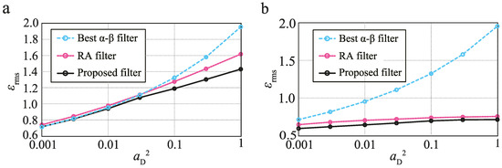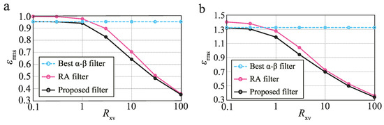 Figure 1 shows the relationship between the design parameter and the RMS index for and 10. From Figure 1a, the proposed filter realizes the best performance for relatively large . This result verifies that the proposed strategy determines gains corresponding to a better covariance matrix of process noise than the RA filter. The proposed filter also achieves better performance compared with the best - filter, including small , and even for , which means that the measurement accuracy of the position and velocity is the same. Furthermore, when the velocity measurement accuracy is high, the proposed filter achieves greater accuracy than the best - filter (Figure 1b). In addition, although the difference between the RA and proposed filters is small for , the proposed filter also achieves the best performance.
