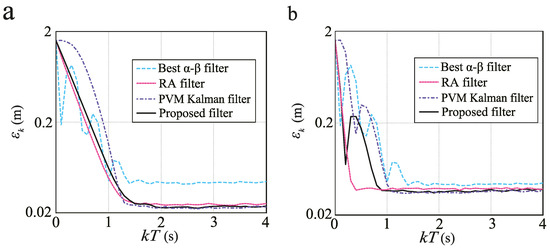 Figure 4 shows the simulation results for ((a) = 9.0, (b) = 1.0). Clearly, the filters using velocity measurements achieve greater accuracy than the best - filter in both cases. For , the mean steady state prediction RMS errors ( in ) of the RA, PVM Kalman and proposed filters are 2.48, 2.30 and 2.33 cm, respectively. These results indicate that the proposed filter achieves better accuracy than the RA filter even for realistic situations. Although the PVM Kalman filter is slightly better than the proposed filter, because it considers the correlated noise in the x- and y-axes, their errors are almost the same. This shows that the steady state performance of the PVM filter is close to that of the --- filter, and the --- filter analysis is effective in performance predictions of the PVM Kalman filters. The relationship of these filters is similar to the traditional - and position-only-measured Kalman filters. The computational load of the --- filter is considerably smaller than that of the PVM Kalman filter; the mean calculation times for each k of the --- and PVM Kalman filters are 14.0 and 38.1 s using an Intel Core i7-4600U CPU@2.10 GHz 2.70 GHz processor and Scilab 5.5.0. This is because the --- filter does not require the adaptive calculations of the gains and error covariance matrices. In addition, although the difference in steady state accuracy between the proposed and best - filters is small (Figure 4b), the proposed filter achieves better accuracy even for =1. The mean steady state prediction RMS errors of the RA, PVM Kalman and proposed filters are 3.84, 3.61 and 3.68 cm, respectively, and these results lead to the same conclusions as those from Figure 4a. These results are matched to the analysis results presented in the previous section.