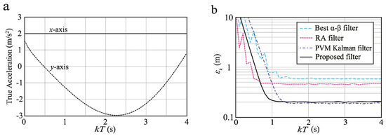 Finally, an application to high-maneuvering targets with relatively high accelerations is presented to clearly show the effectiveness of the proposed filter compared with the RA filter. Given the true target position of (, ) = (, ), the true acceleration is plotted in Figure 5a. Compared with the previous section, a high acceleration is assumed. We set = 0.3, = 1.0, m/s and = 1.0; other settings are the same as in the previous section.
