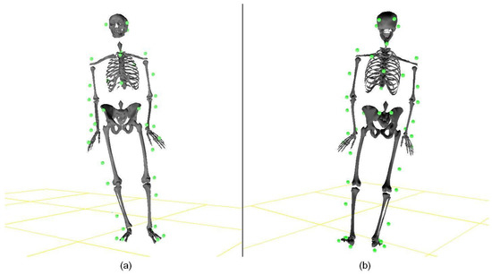 Placement of the 42 reflective markers for full-body biomechanical modeling [19,20,21]: (a) a front view; (b) a back view. The asymmetric placement of the markers on limbs was used for distinguishing the left and right side of the body during motion capture.