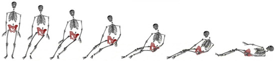 After positional data was captured, it was applied to a 15-segment biomechanical model. The 15 segments were head, upper torso, lower torso, upper arms, forearms, hands, thighs, legs, and feet. Data was filtered using a five-point moving average filter (weighted: 1-3-4-3-1). The model calculations supplied the positions, speeds, and accelerations of each marker, as well as all joint angles: flexion/extension (Flex/Ext), abduction/adduction (Ab/Add), and rotation, i.e., the motor controls of fall and non-fall situations. A 3D sample of side-fall characterized by the 15-segment biomechanical body model was shown in Figure 5. In 3D body modeling, inertial characteristics for each segment were determined by applying anthropometric regression equations with individual body mass, body height, and gender as input parameters [19]. Using the biomechanical model, sensitive sensor locations and threshold values for distinguishing daily activities and falls were quantified.