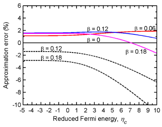 The accuracy of this empirical approximation for Equation (14) has been numerically calculated in the case of λ = 1 (larger errors are resultant for λ = 1 than λ = 0), and the results are depicted in Figure 1. Note that the approximation is quite accurate with a maximum error of less than 2% over a very wide range of ηc for the extensive variation of β values. In the same figure, calculated errors induced by the binomial approximation are also depicted in dashed curves typically for β = 0.12 and 0.18 for comparison. As shown, the errors of this approximation increase largely with the FE for ηc > 3, and in particular, the error is significantly larger for the large value of β = 0.18 at Fermi energies of ηc > 5.