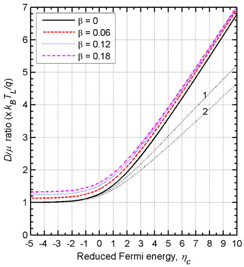 In the same figure, the D/μ ratios calculated for electrons using the existing formula Equation (6) are also plotted typically for β = 0.06 (dashed curve 1) and β = 0.18 (dashed curve 2). It is worth noting that there are substantial differences in value between the results of the new formula and the existing formula. The results of the existing formula show that the D/μ ratios are not affected by the amounts of band nonparabolicity in the nondegenerate condition. An additional physically improper aspect is that band nonparabolicity causes the D/μ ratios to decrease quite significantly below the values obtained for β = 0 (parabolic energy band case), even for the small value of β = 0.06, in the high degenerate condition.
