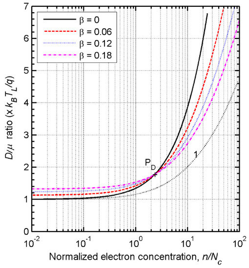 The electron concentration dependencies of the diffusion coefficient and the FE for a given semiconductor material can be easily determined from Figure 2 and Figure 3. In other words, we can find the value of the D/μ ratio and thus the value of the diffusion coefficient from Figure 3 with known values of n (or ND for homogeneous materials with dopants fully ionized), Nc, μ, and β, and thereafter the FE value also from Figure 2.