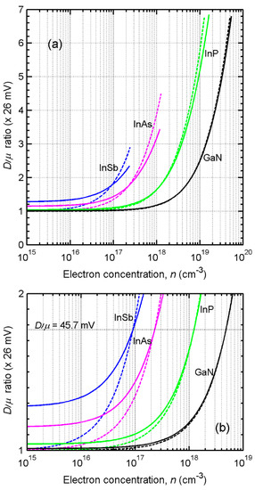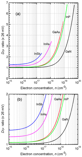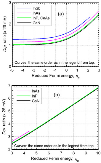 Figure 4, Figure 5 and Figure 6 have been obtained by considering only the lowest CB. However, the compound semiconductors used for these figures have another upper CB, in which it is possible for some electrons to occupy at very large Fermi energies, i.e., in heavy-doping conditions. In GaAs, the upper CB is separated only by 0.3 eV from the lowest CB, while it is separated by 0.4 eV or more than this energy in the other semiconductors (∆Г−L = 0.3 eV for GaAs, ∆Г−X = 0.4 eV for InSb, ∆Г−L = 0.59 eV for InP, ∆Г−L = 0.72 eV for InAs, and ∆Г−X = 1.22 eV for GaN) [26]. It has been found at room temperature that for the semiconductors, except GaAs, the electron concentration in the upper CB is negligibly small at ηc = 10; this is not so for GaAs when ηc > 7 or n > 7.5 × 1018 cm−3, as indicated by the extension of the D/μ ratio curve for GaAs with dashes for values above D/μ = 4.8 (×26 mV) in Figure 5a.