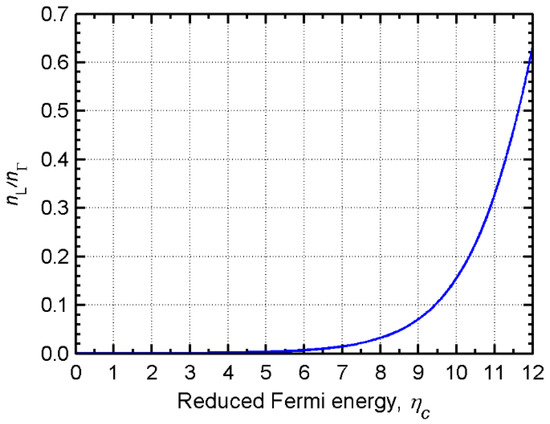 In GaAs, the upper CB consists of four equivalent L-valleys. The electron concentration in this CB, nL, has been additionally calculated in thermal equilibrium for TL = 300 K, and the ratio of nL to nГ is plotted as a function of ηc in Figure 7 (nГ denotes the electron concentration in the lowest CB (Г-valley). For the calculation of nL, α = 0.46 for the nonparabolicity [19] and 0.56me, where me is the free electron rest mass, for the electron DOS effective mass [26] were used for the L-valleys, based on the isotropic band approximation. Figure 7 shows that at ηc = 10, the concentration ratio, nL/nГ, amounts to 0.16, and at ηc = 12, it reaches up to 0.63, due to a very large value of the effective DOS, Nc, of the upper CB, which is 24 times larger than that of the lowest CB. Therefore, for GaAs the electron population in the upper CB cannot be neglected and will affect the D/μ ratio for conduction electrons at very large Fermi energies or electron concentrations at room temperature. In addition, from Figure 7, the following very important fact can be deduced. If we assume that the energy separation (∆Г−L) of GaAs is 0.4 eV, rather than 0.3 eV, then the concentration ratio at ηc = 10 will decrease to less than 1%, which is the value corresponding to the concentration ratio when the position of ηc has changed from 10 to 6.1 in Figure 7. This suggests that in semiconductors, the electronic property of the band structure above 0.4 eV from the lowest CB edge does not affect the D/μ ratio for conduction electrons generally at room temperature, unless they are doped excessively so that ηc exceeds 10, even though they have multiple CB bands.