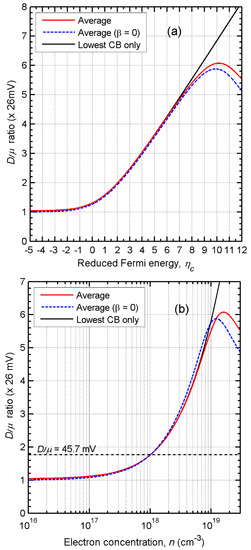 Thus, it has been calculated and presented in Figure 8 as a function of the reduced FE in the plot (a) and also as a function of the total electron concentration, i.e., n = nГ + nL, in the plot (b). In this figure, the average D/μ ratio calculated in the case of β = 0 (for both the lowest and upper CBs) are additionally shown by a dashed curve for comparison. These two curves are also compared in the figure with the other additional curve obtained by considering the lowest CB only, i.e., completely neglecting the existence of the upper CB (n = nГ in this case). All of the results are for TL = 300 K.
