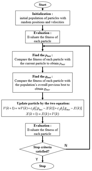 The flow chart of the particle swarm optimization (PSO) algorithm.