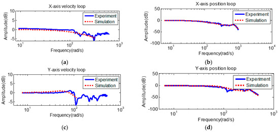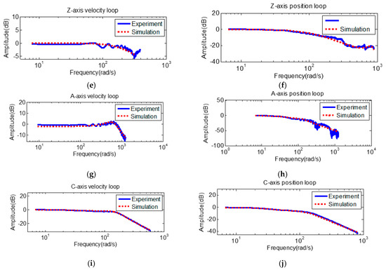 Frequency responses of velocity loop and position loop. (a) X-axis: velocity loop. (b) X-axis: position loop. (c) Y-axis: velocity loop. (d) Y-axis: position loop. (e) Z-axis: velocity loop. (f) Z-axis: position loop. (g) A-axis: velocity loop. (h) A-axis: position loop. (i) C-axis: velocity loop. (j) C-axis: position loop.