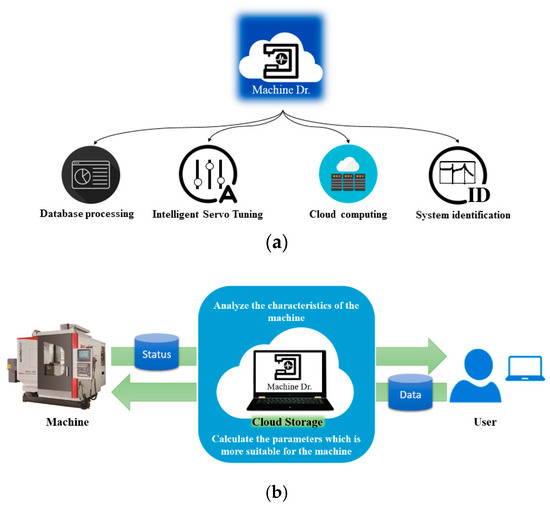Illustration of the cloud platform—Machine Dr. system; (a) functions illustration; (b) communication between the user and the cloud servo system.