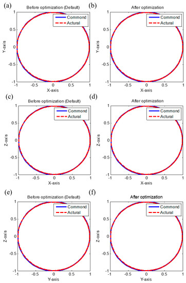 Simulation result of circular motion tests. (a) Before optimization (X-Y), (b) After optimization (X-Y), (c) Before optimization (X-Z), (d) After optimization (X-Z), (e) Before optimization (Y-Z), (f) After optimization (Y-Z).