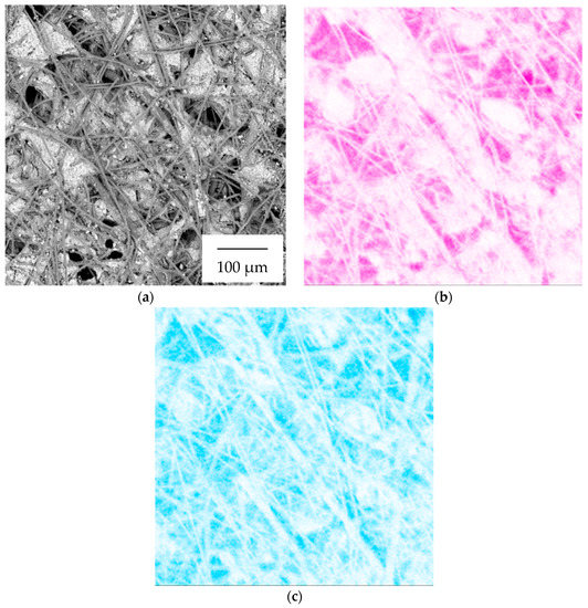 Composite sheets consisting of TiO2 and zeolite (HSZ-385 or F-9) were prepared using a papermaking technique. TiO2, zeolite (3.125 g each), and polyethylene terephthalate fiber (6.25 g) were suspended in water (1 L); a cationic flocculant [poly-(amideamine) epichlorohydrin, 0.05% of total solid] and an anionic flocculant (anionic polyacrylamide, 0.084% of total solid) were sequentially added and the final suspension was stirred. Hand sheets with a grammage of 200 g/m2 were prepared according to JIS P8222 [30]. The sheets were dried at 120 °C. The mass ratio of TiO2 to zeolite in the composite sheet was 1:1. The TiO2/zeolite composite sheet used in this study contained 4 mg/cm2 of TiO2 and zeolite. Characterization of the TiO2/zeolite composite sheet was performed by scanning electron microscopy-energy dispersive X-ray spectroscopy (SEM-EDS: ProX; Phenom World) as shown in Figure 1. The SEM and EDS images revealed the uniform distribution of TiO2 and zeolite powder in the composite sheet.