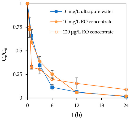 The TiO2 photocatalysis could be inhibited via the scavenger effect by coexisting ions [10,38,39,40]. The ions Cl− and HCO3− have been found to inhibit photocatalysis through the hydroxyl radical and valence band hole scavenging [10,40]. Rioja et al., reported a marked deactivation effect caused by added salts for two tested acidic drugs [41]. Furthermore, Tokumura et al., suggested that coexisting matter could mitigate the generation of hydroxyl radicals through direct reactions with holes in the valence band and electrons in the conduction band of the photocatalyst [37]. As reported by Song et al., Cl− can cause agglomeration of TiO2 particles in a slurry by suppressing the stabilizing effect of electrostatic repulsion, reducing the effective contact surface between the photocatalyst and the pollutants [42]. In this research, the TiO2/zeolite composite sheet was used instead of TiO2 powder. Therefore, even if the RO concentrate contained 316 mg/L Cl− (Table 1), agglomeration of TiO2 and its associated issues should be eliminated. However, the mechanism for this should be investigated in future research.