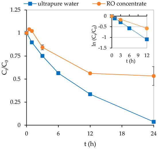The photocatalytic degradation of crotamiton over time by the F9/P25 composite sheet is shown in Figure 3. Direct photolysis of crotamiton was not observed [31]. The removal efficiency of crotamiton from the RO concentrate was much lower than that from the ultrapure water. After 24 hr of UV irradiation, the majority of the crotamiton in the ultrapure water was degraded. In contrast, ca. 50% of the crotamiton was degraded in the RO concentrate. Linear relationships were found between ln (Ct/C0) and UV irradiation time (t) (Figure 3). Therefore, the first-order kinetic model shown in Equation (4) was used to evaluate the photocatalysis of crotamiton. In that equation, k1 is the pseudo-first-order rate constant. The k1 value for crotamiton removal from the RO concentrate by the F9/P25 composite sheet was 0.048 hr−1, and was only half of that in the ultrapure water (0.092 hr−1). Obviously, the lower rate constant reflects the effect of other components in the RO concentrate on the photocatalytic degradation of crotamiton.