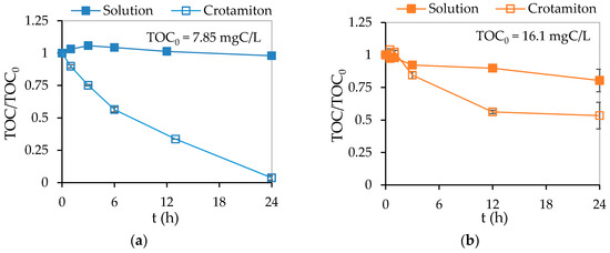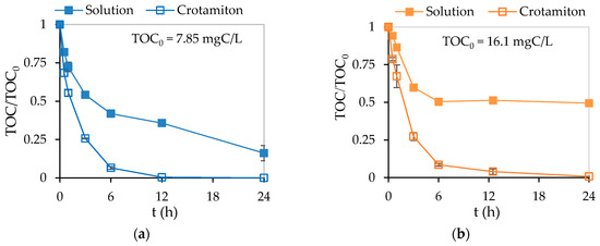 Removal of TOC in the solutions and the TOC derived from the residual crotamiton during the treatment by the F9/P25 composite sheet with ultraviolet irradiation in ultrapure water (a) and RO concentrate (b). Results are means ± standard deviations (n = 2).