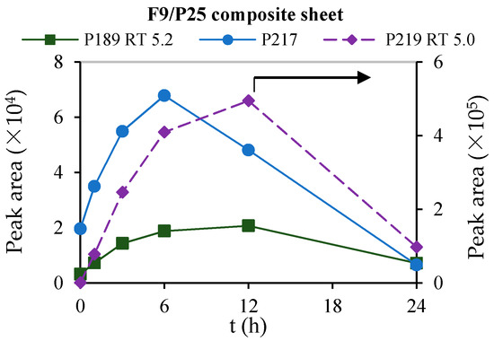 Changes in the peak areas of the major intermediates over time in ultrapure water when crotamiton was photocatalytically degraded using the F9/P25 composite sheet (C0 = 10 mg/L). The squares are P189 (retention time 5.2 min) and the circles are P217. The diamonds with a dashed line are P219 (retention time 5.0 min, secondary y-axis).