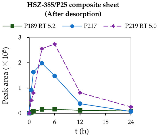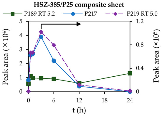 Moreover, changes in the peak areas for the major intermediates in the HSZ-385/P25 composite sheet were evaluated through desorption treatment for the composite sheet after the adsorption and photocatalysis experiment. The methanol solution with the composite sheet after ultrasonic treatment contained crotamiton, as well as large amounts of degradation intermediates, retained in the composite sheet (Figure 9). The peak area for P219 was higher in the composite sheet during treatment than that in the aqueous phase when using the HSZ-385/P25 composite sheet shown in Figure 8. Even if the efficiency of desorption of the intermediates from the sheet could not be confirmed without the standard of every detected intermediate, the high peak areas for the intermediates provided direct evidence of the adsorption of intermediates on the composite sheet.