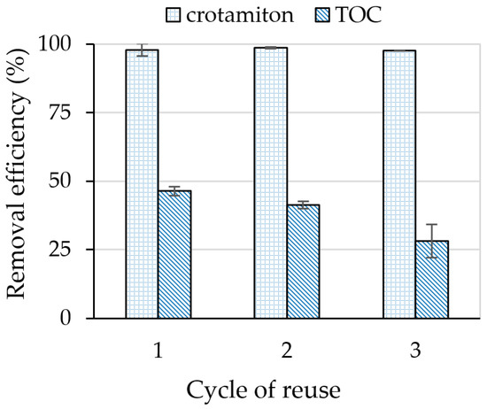 The removal efficiency of crotamiton and TOC in RO concentrate using the HSZ-385/P25 composite sheet after cyclic use. Results are means ± standard deviations (n = 2).